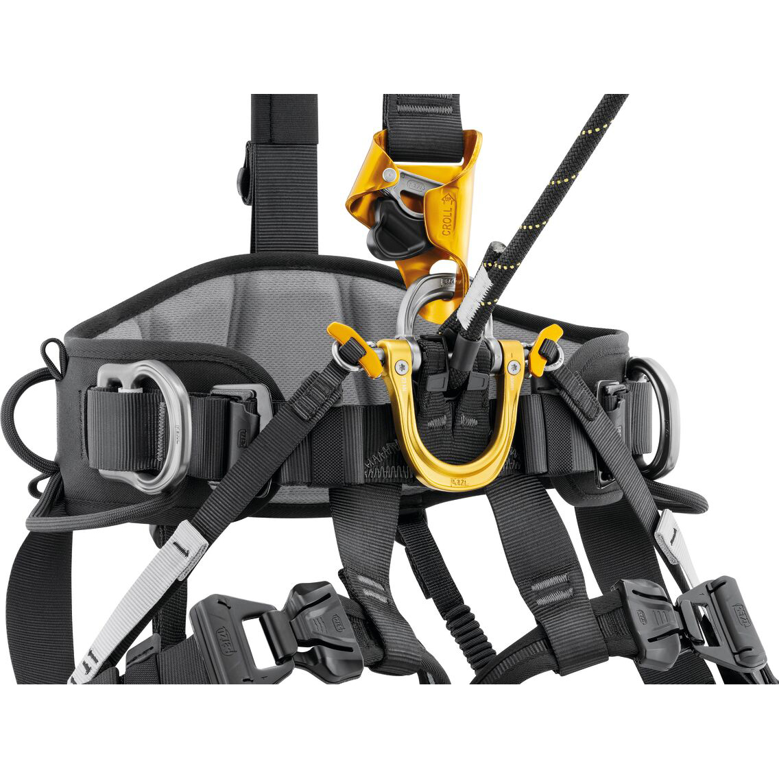 一体型CROLL Lロープクランプは、ロープ登高の効率を向上させます。ウエストベルトには金属製のサイドアタッチメントポイント、装備ループ、ツールホルダースロットが備わっており、1日の作業に必要な装備をすべて整理して持ち運ぶことができます。