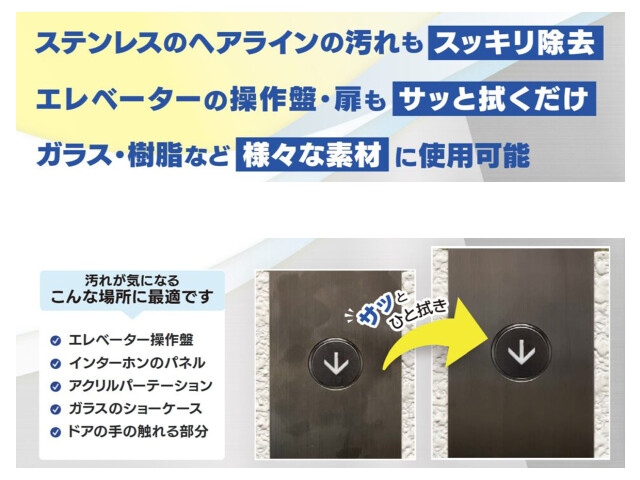 ステンレス(エレベーター操作盤、ドアノブ、手すり、レンジフード、配管パイプ、ヘアライン・バイブレーション加工されたパネル等)に付着した手あか・汚れの除去